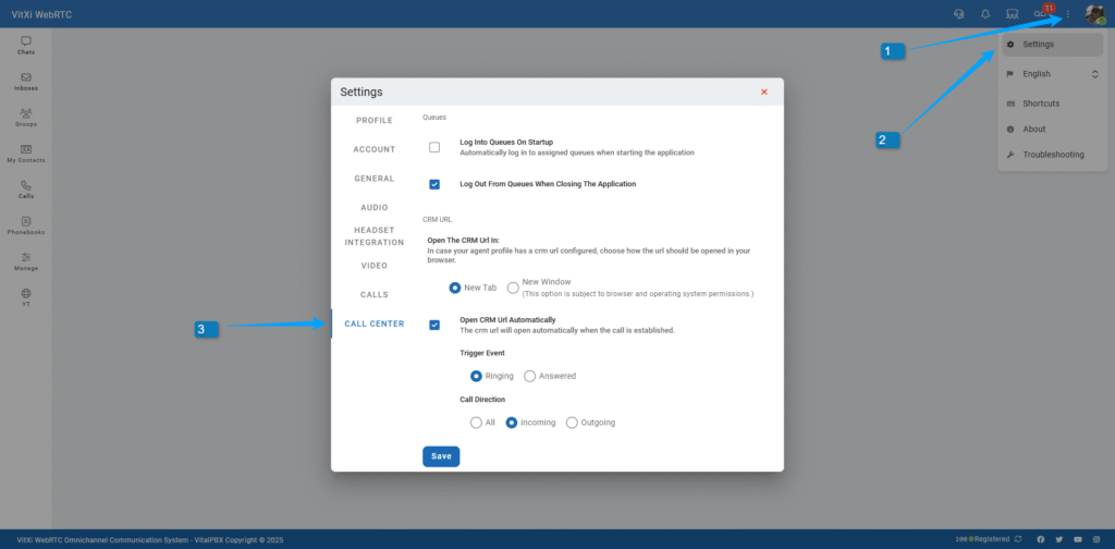 For users with call center permissions, this section controls agent queue behavior and CRM interaction.