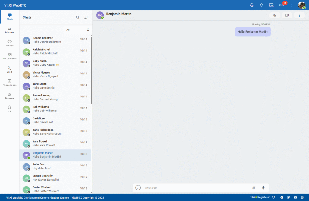 The Chats module in VitXi WebRTC allows users to exchange instant messages with other users or groups in real time.