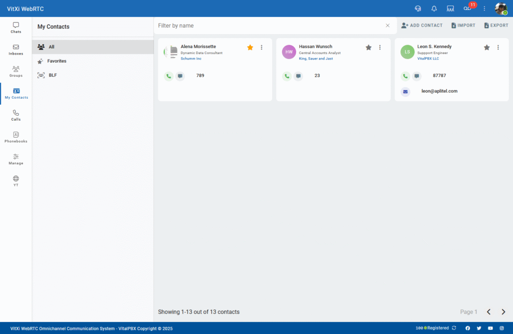 The My Contacts module in VitXi WebRTC allows users to manage personal and organizational contacts in one place.
