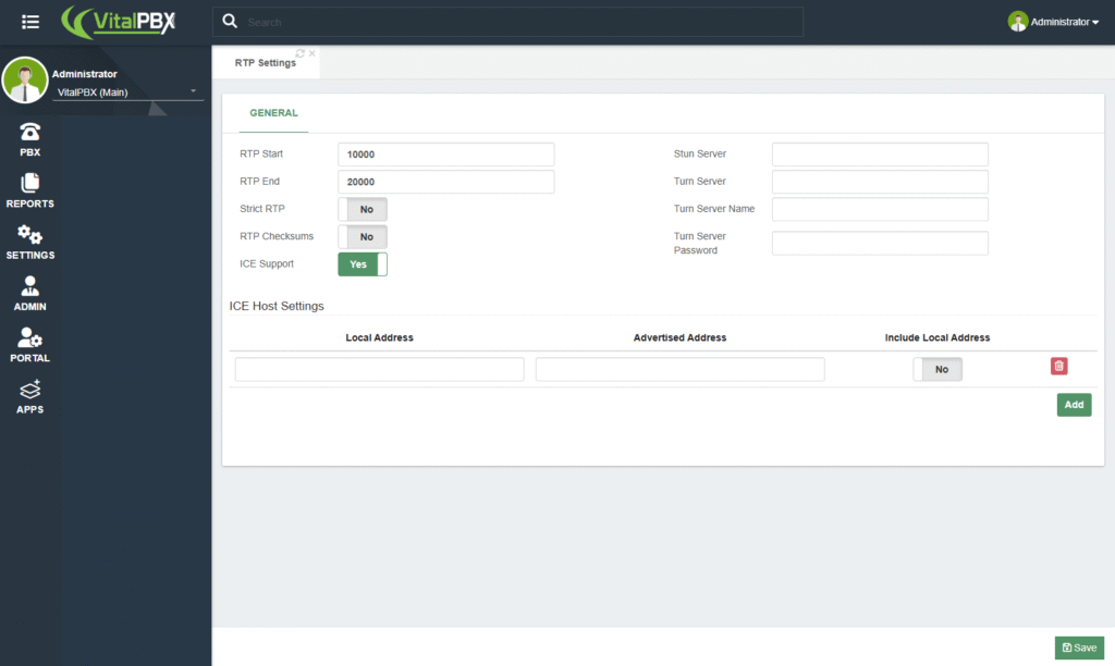 - Navigate to: Settings/PBX Settings/RTP Settings